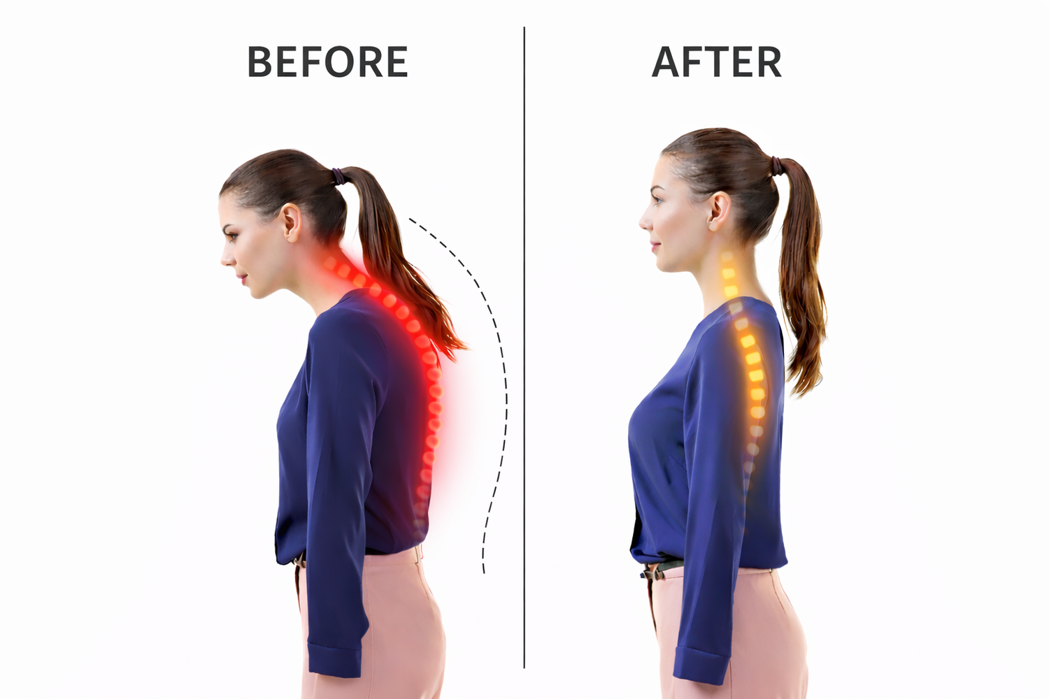 Long hours at your desk, phone use, and daily habits slowly train your body into a harmful position. Over time this leads to neck pain, back tension, fatigue and reduced confidence.